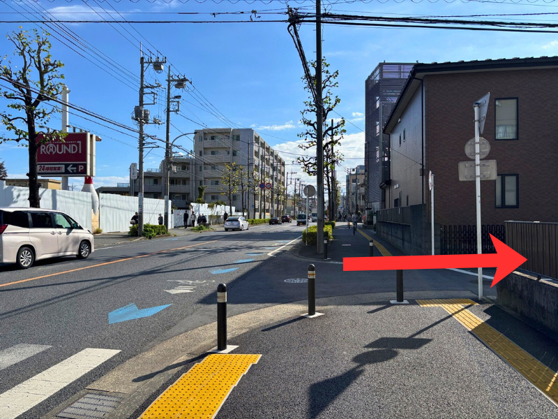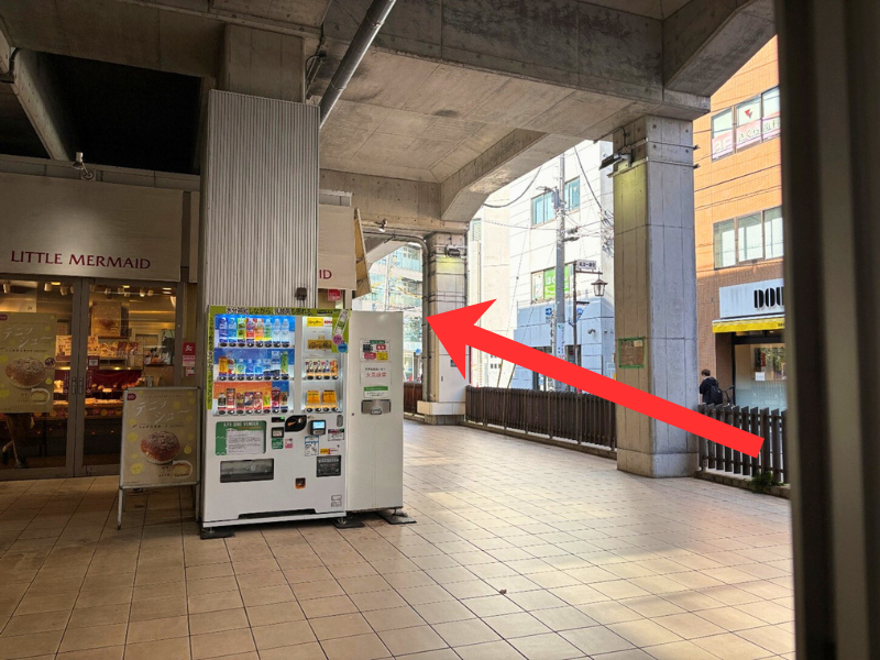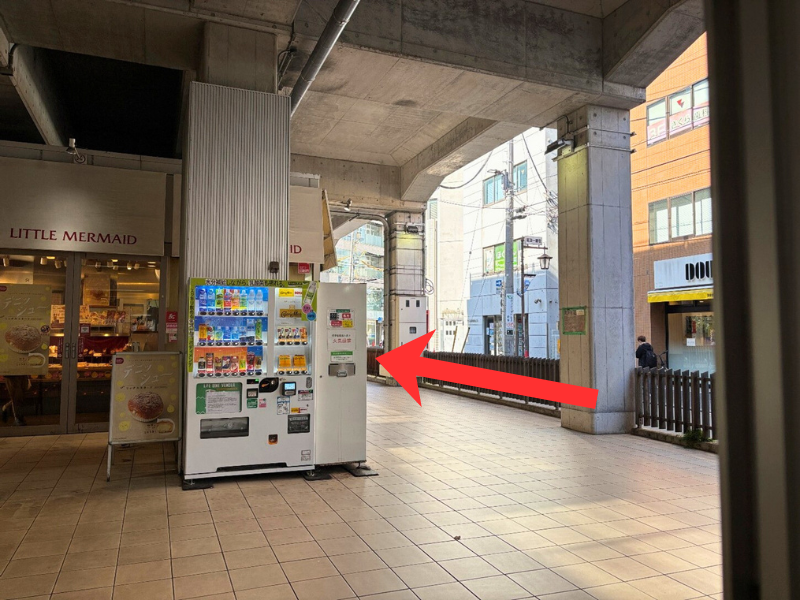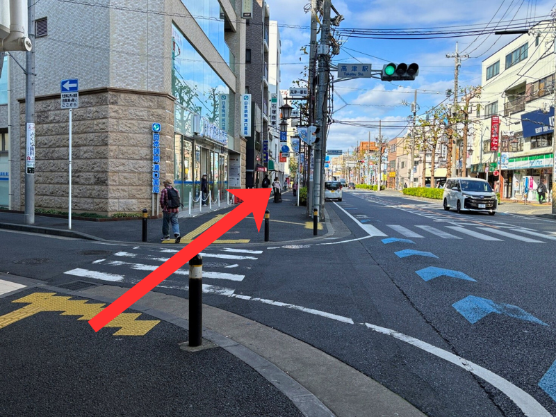 改札を出て、パン屋脇を通り、横断歩道へ向かいます。