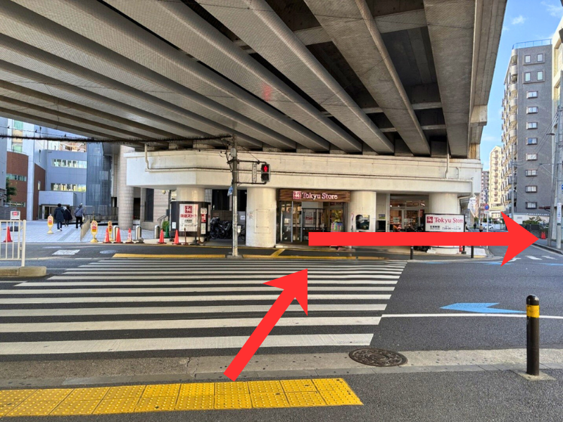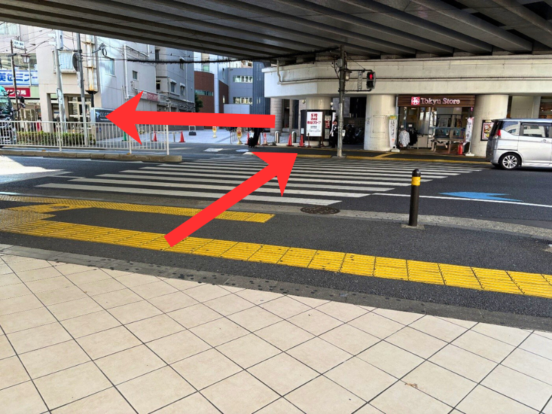 ② 横断歩道を渡り、右折し、横断歩道を渡ります。