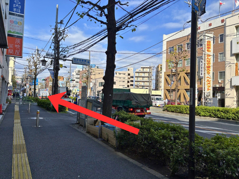②横断歩道を渡り、左折します。しばらくそのまま進みます。