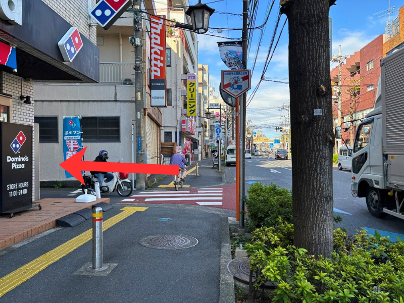 ④ 木田金物店、ドミノピザの間の通りを左折します。